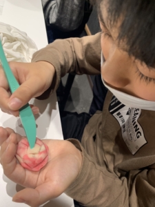 職人さんの指示を聞きながら、丸めて伸ばして、耳つけて、花びらを書いて、、、と