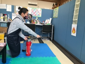 今月の防災訓練は消火器の使い方を体験しました。