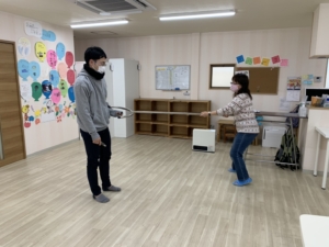 さすまたは護身用具です。不審者へ適切に対応するための4つのポイントを確認したり動画をみたりした後練習を行いました。
