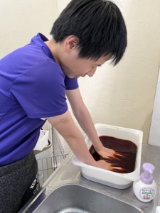 防災訓練 2023.06.02 お知らせ プログラム牧の里 暑い夏より梅雨時期の管理が難しいと言われていますね。 そこでいつもの手洗い方法でどれだけ汚れが取れているのか、可視化する実験をしました。「ちゃんと洗ったのに全然取れてない!」と一生懸命手洗いする子どもも居ました👏