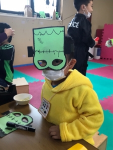 腕飾り、仮面作りの製作では好きなハロウィンキャラクターを選んで、飾り付けを楽しみます。なかなかの完成度ですよね。