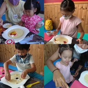 Desta vez fizemos crepe com diversas frutas junto com as crianças.