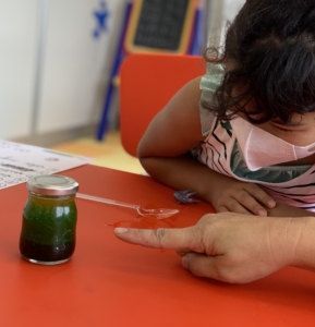 水や油、お酢など身近にある材料で子どもたちが驚くような実験を披露、実践しました。