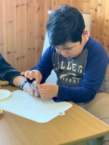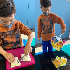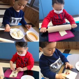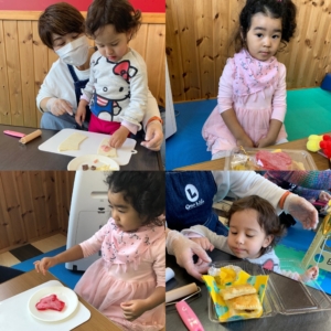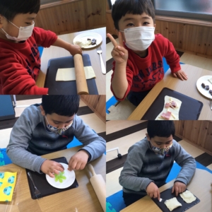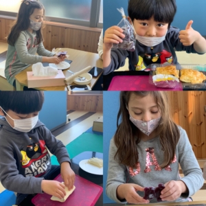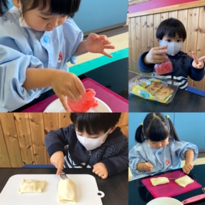 Cooking day 2021.03.14 プログラムOKAZAKI お知らせ 2021.3.14 今回は新しいオーブンを使って、チョコレートとハム&チーズの2種類のパイを焼きました。 楽しい時間を過ごしながら五感を刺激したり、ルールや衛生面を学びました。 子ども達は一生懸命パイ生地をのばして、具を詰めていきました。 オーブンで20分温めている間に、作るのはグミです。グミとゼリーに砂糖をまぶしていきます。 完成したパイはとても美味しそうで、いい匂いが部屋いっぱいになりました。