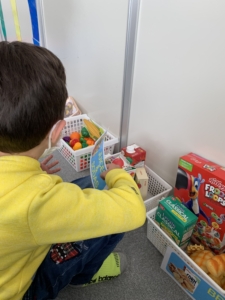 リストを見ながら買うものをかごに入れておもちゃのレジに並びます。
